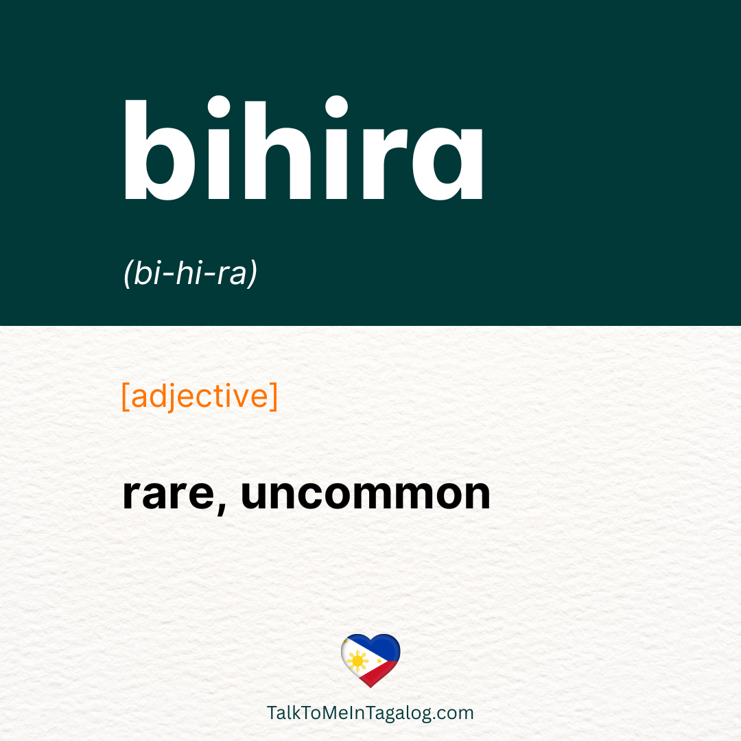 The Tagalog word “Bihira” is your key to accurately saying “rarely” or “seldom” in Filipino! This essential Tagalog lesson provides a comprehensive guide to understanding “Bihira’s” meaning and its vital grammar function as an adverb of frequency. Learn precisely how to use “Bihira” in everyday Filipino sentences to express infrequent actions or events. Our clear example sentences will demonstrate its natural placement and application in conversation. Perfect for beginner Tagalog learners looking to expand their conversational Filipino vocabulary, precisely describe occurrences, and improve their overall Tagalog fluency in expressing frequency.