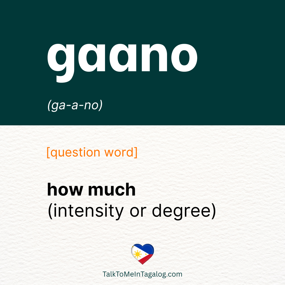 How to say “how much,” “how long,” or “how + adjective” in Tagalog often comes down to the word “gaano,” a flexible question word used when asking about degree, amount, or intensity. Filipinos use gaano in everyday questions about distance, duration, size, emotion, and all kinds of measurable qualities. You’ll find natural Tagalog examples with English translations that show how gaano actually works in real conversation, giving you a clearer sense of when and how to use it without sounding stiff or overly formal.